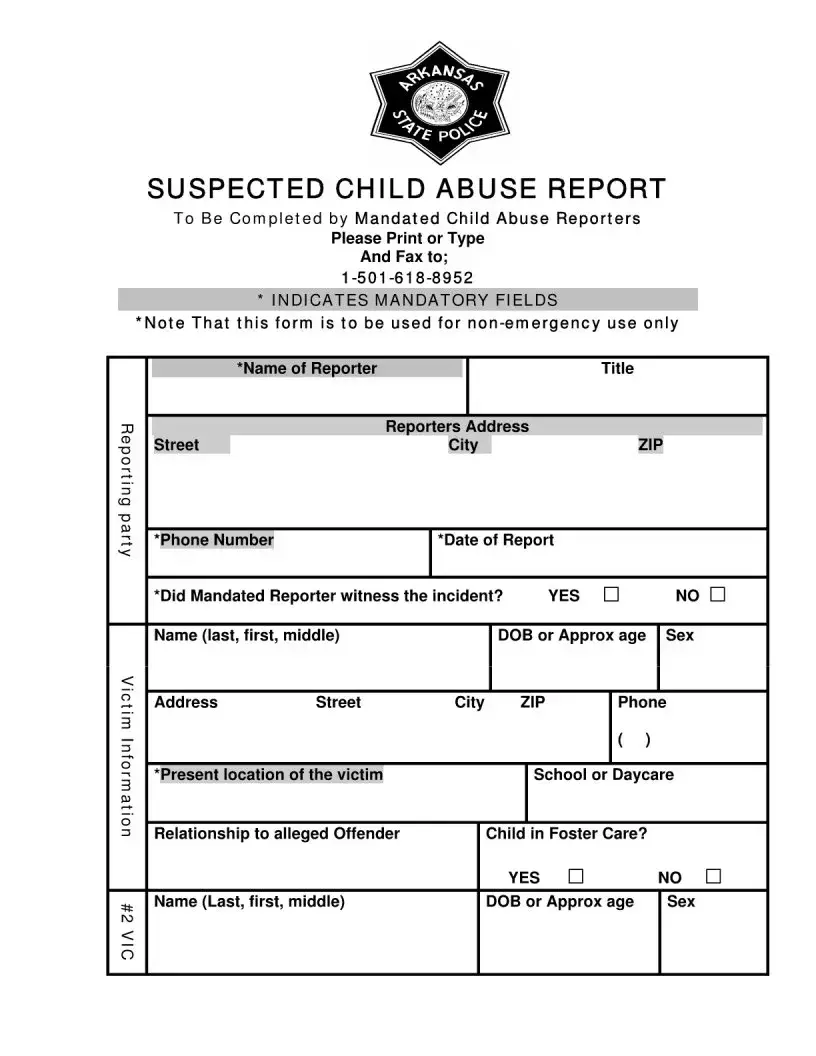 The Arkansas Child Abuse form is designed to facilitate the reporting of suspected child abuse by mandated reporters. This includes professionals who are legally required to report any signs of abuse they observe or suspect. The form collects essential information about the incident, the victim, and the alleged offender to ensure that authorities can investigate the matter thoroughly.