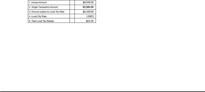 To compute the amount of rebate, take the invoice amounts exceeding $2,500 (not including tax) and subtract $2,500 from the total Invoice amount. This result is multiplied by the local tax rate that is applicable and the product is the local tax rebate.