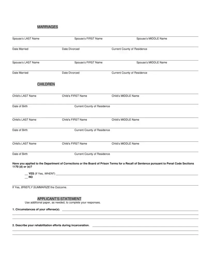 The California Executive Clemency form shares similarities with the federal pardon application. Both documents allow individuals to request forgiveness for past offenses, aiming to reintegrate into society. The federal pardon application requires information about the applicant's criminal history, rehabilitation efforts, and reasons for seeking clemency. Like the California form, it emphasizes the importance of demonstrating personal growth and remorse, fostering a sense of accountability and a desire for a second chance.