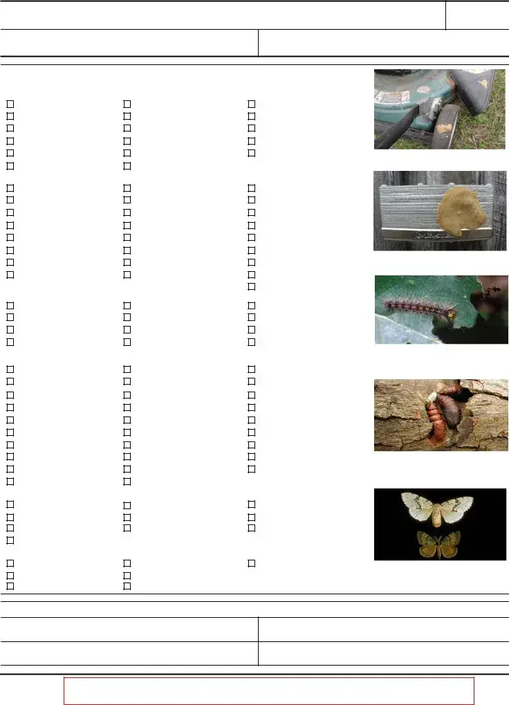 The California Gypsy Moth Checklist form is an essential tool for residents moving from a gypsy moth quarantine area to a non-quarantine area. This form outlines the legal requirements that individuals must follow to prevent the spread of this invasive pest, which can cause significant damage to a wide variety of trees and shrubs. Before making a move, individuals must inspect their outdoor household items for any signs of gypsy moth life stages, including egg masses. The checklist provides a straightforward self-inspection process, allowing homeowners to verify that their belongings are free from infestation. If needed, they can also hire a certified applicator to conduct the inspection. The form emphasizes the importance of keeping a completed checklist during the move, as it serves as proof of compliance with federal regulations. Moreover, the checklist is designed to be user-friendly, featuring various categories of outdoor items that require inspection, from recreational equipment to building materials. By adhering to these guidelines, individuals not only protect their new neighborhoods but also contribute to the broader effort of controlling the gypsy moth population in California.