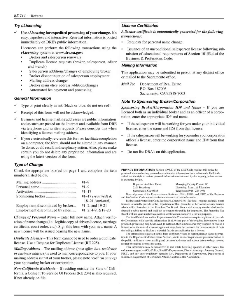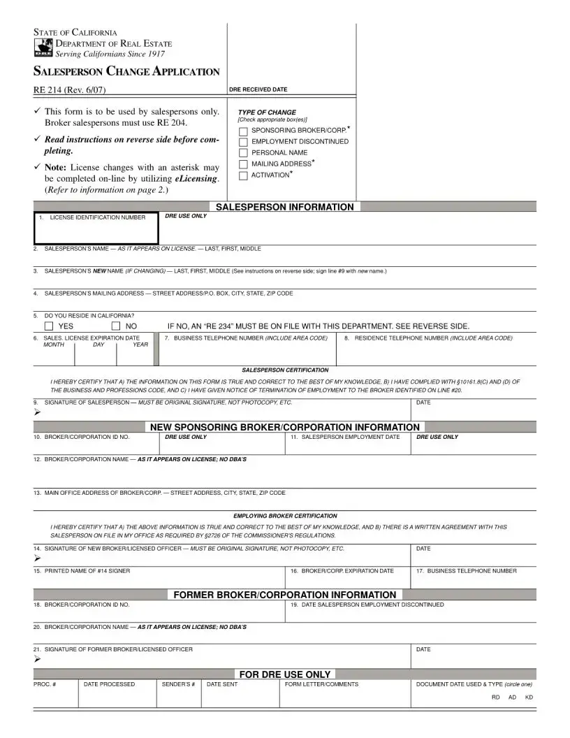 Filling out the California RE 214 form is an essential step for salespersons looking to make changes to their employment status or personal information. After completing the form, it should be submitted to the Department of Real Estate either in person or by mail. Ensure all information is accurate and complete to avoid delays in processing.