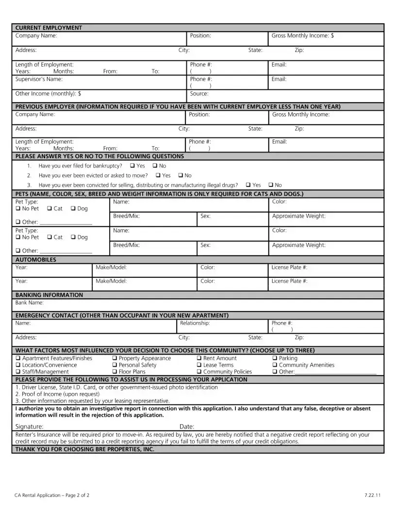 The California Rental Application form serves as a crucial tool for individuals seeking to rent an apartment in the state. Each person aged 18 or older must complete their own application, ensuring that all potential occupants are thoroughly vetted. This form requests essential information, including the applicant's legal name, date of birth, and contact details. Importantly, it allows the property management to obtain a credit report and verify the information provided. Applicants must also disclose their Social Security Number or an alternative form of government-issued ID if necessary. Additionally, the form collects details about current and previous addresses, employment history, and income. Questions regarding bankruptcy, eviction history, and criminal convictions help landlords assess the applicant's reliability. Furthermore, the form includes sections for pet information and emergency contacts, as well as factors influencing the applicant's choice of community. To complete the application, individuals must provide identification and proof of income upon request. By gathering this information, the California Rental Application aims to create a transparent and fair rental process for all parties involved.