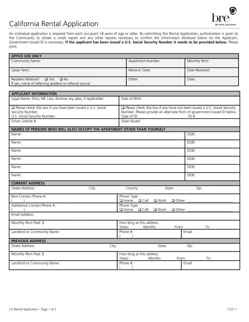 The California Rental Application is a crucial document for anyone looking to rent a home in the state. This form requires information from each occupant aged 18 and older, allowing property managers to assess potential tenants. By completing this application, you authorize the community to check your credit and verify the details you provide.