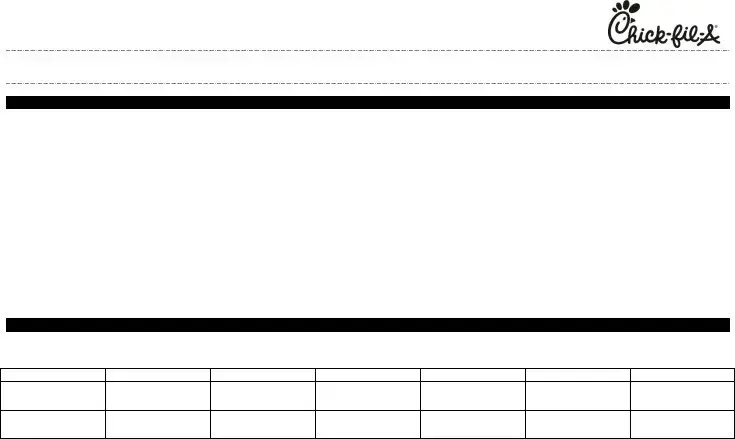 Applying for a job at Chick-fil-A can be an exciting step for many individuals seeking employment in a dynamic and customer-focused environment. The Chick-fil-A job application form is designed to gather essential information about potential employees, ensuring that the hiring team can assess each candidate's qualifications and fit for the company culture. This form typically includes sections for personal details, work history, and education, allowing applicants to showcase their experience and skills. Additionally, it often features questions that help the employer understand an applicant's availability and interest in specific roles, whether in front-line service or behind-the-scenes support. By providing a clear structure, the application form not only streamlines the hiring process but also encourages candidates to reflect on their strengths and how they align with Chick-fil-A's values. Completing this form thoughtfully can set the stage for a successful interview and a rewarding career with one of America's favorite fast-food chains.