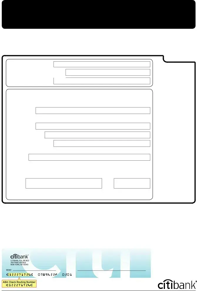 The Citibank Direct Deposit form shares similarities with the W-4 form, which is used by employees to inform their employer of their tax withholding preferences. Both documents require personal information, including name, address, and Social Security number. They serve a crucial role in ensuring that financial transactions, whether it’s direct deposit or tax withholdings, are processed accurately. Just as the W-4 helps determine the amount of federal income tax withheld from paychecks, the Direct Deposit form ensures that your paycheck is deposited directly into your bank account without any delays.