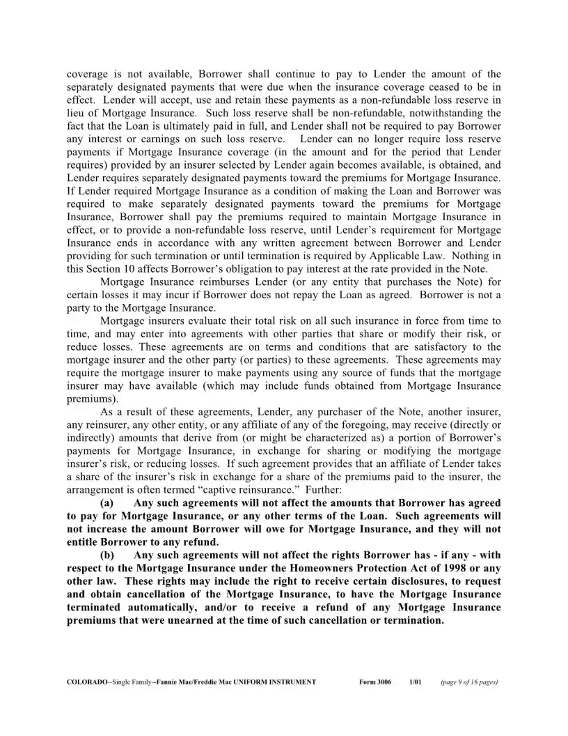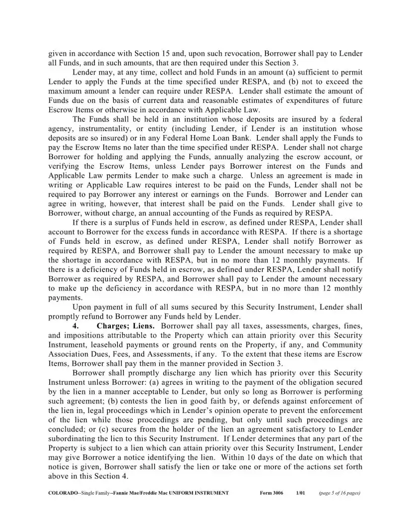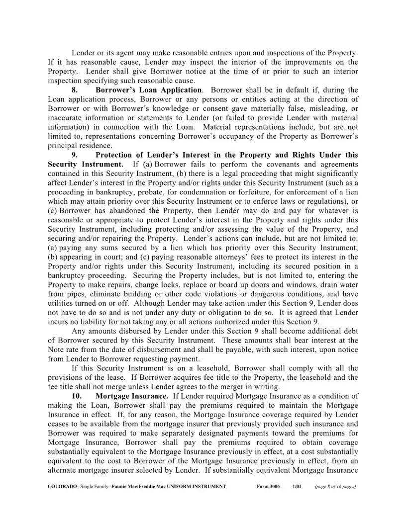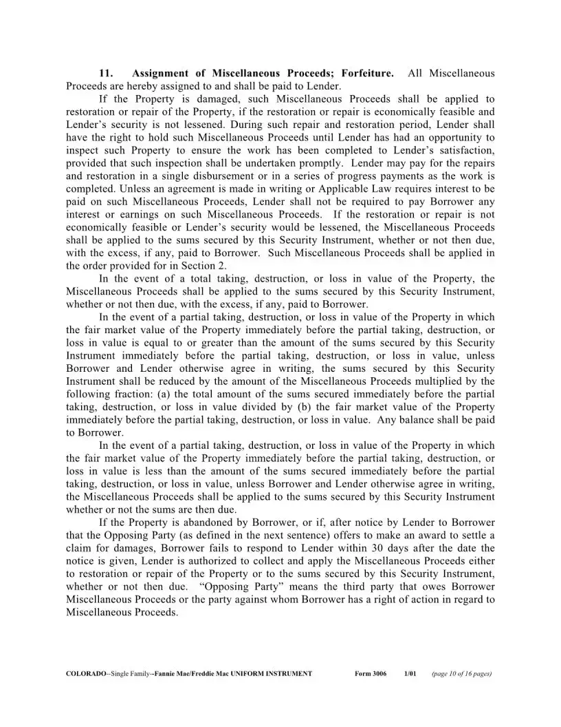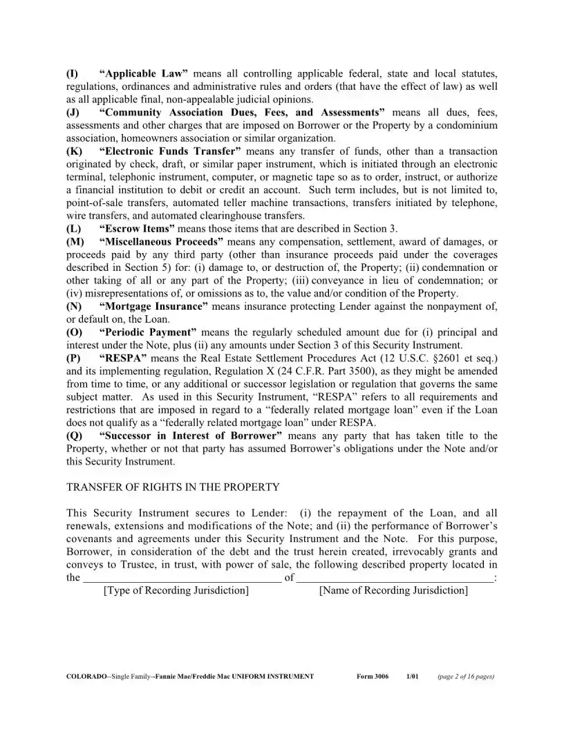 The Colorado 3006 form serves as a crucial document in real estate transactions, particularly in the context of securing loans through a deed of trust. This form outlines the relationships and responsibilities among the borrower, lender, and trustee, establishing the legal framework for the loan agreement. Key definitions are provided within the document to clarify terms such as "Borrower," who is the individual or entity borrowing the funds, and "Lender," the financial institution providing the loan. The form also identifies the "Trustee," typically a public official responsible for overseeing the deed of trust. A significant aspect of the Colorado 3006 is its inclusion of various riders, which are additional provisions that may modify the terms of the loan or address specific circumstances related to the property. Furthermore, the document details the obligations of the borrower, including the payment of principal, interest, and any associated fees, as well as the legal implications of default. The Colorado 3006 form is not merely a transactional tool; it embodies the trust placed in the borrower by the lender and establishes a mutual understanding of the terms governing the loan. By delineating these responsibilities and rights, the form aims to protect the interests of all parties involved in the transaction.