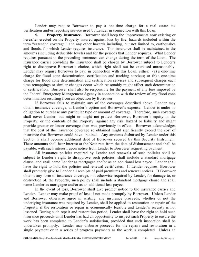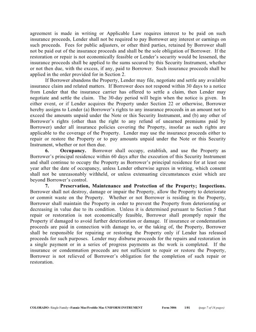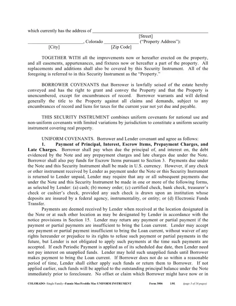 Another document that resembles the Colorado 3006 form is the Promissory Note. This document explicitly states the borrower's promise to repay the loan amount, detailing the principal, interest rate, and repayment schedule. While the Colorado 3006 form secures the loan with the property, the Promissory Note serves as a standalone document that outlines the borrower's financial obligation. Both documents work in tandem: the Promissory Note details the terms of the loan, while the Colorado 3006 form provides the lender with a legal claim to the property should the borrower default.