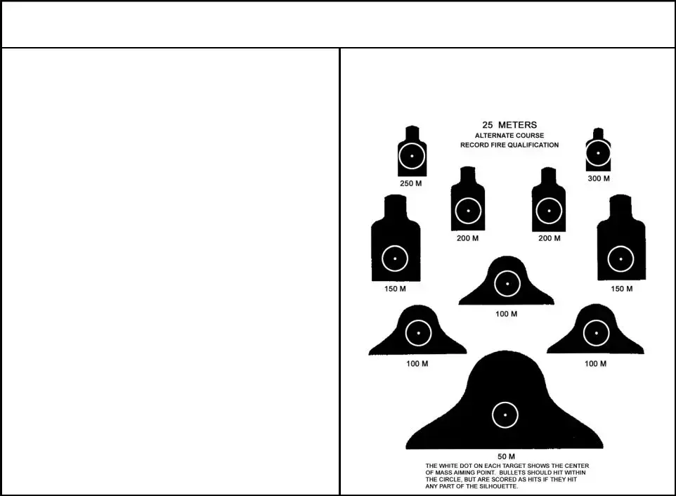 This scorecard is used to score alternate course record fire qualification when the 25-meter scaled silhouette target (NSN 6920-01-167-1398) is used. The alternate course is used only when standard record fire and known distance ranges are unavailable.