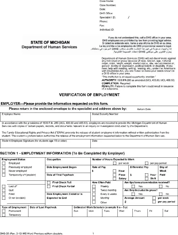 The Dhs 38 form is a document used by the Michigan Department of Human Services (DHS) to gather essential employment and income information from employers. It is a crucial part of the process for individuals seeking assistance or benefits from the DHS. The form ensures that the DHS can verify employment status, income, and other relevant details necessary for determining eligibility for services.