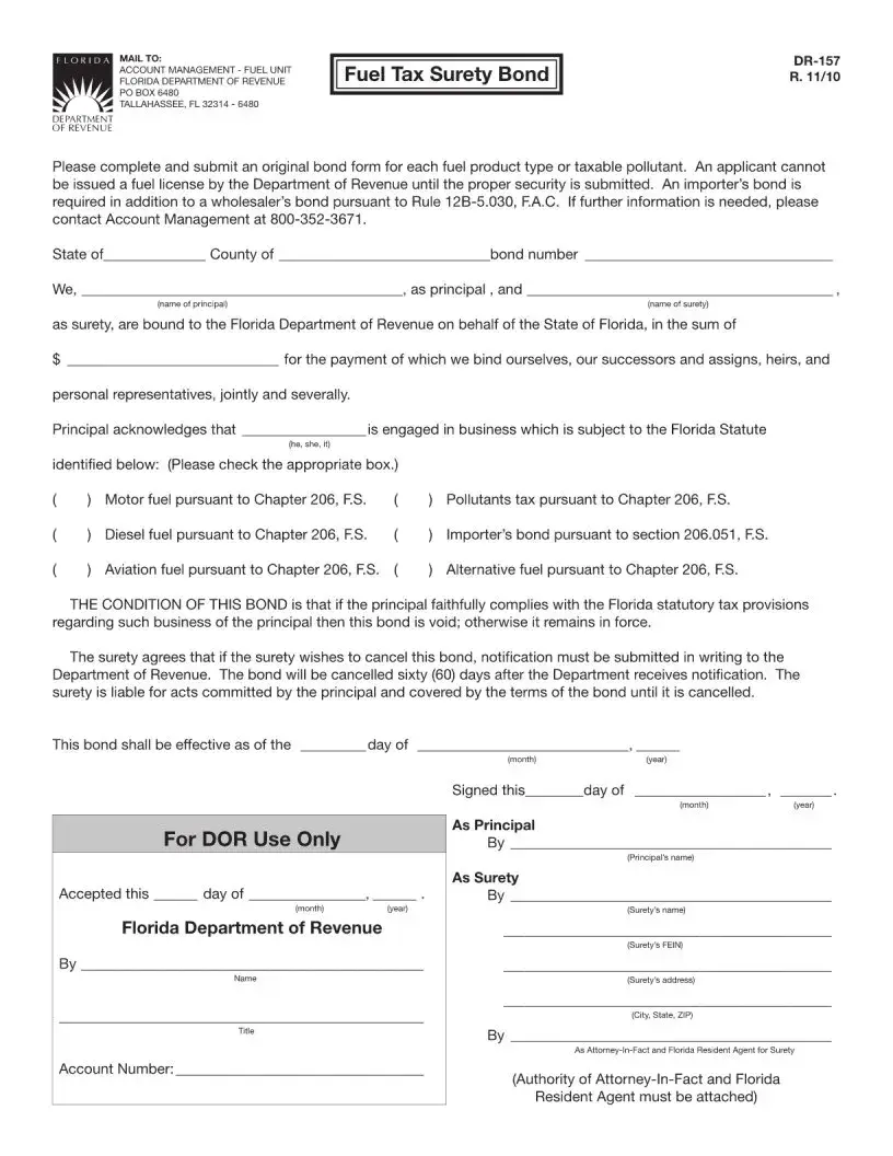 The Florida DR 157 form is a Fuel Tax Surety Bond required by the Florida Department of Revenue. This form must be completed and submitted for each type of fuel product or taxable pollutant to obtain a fuel license. Proper security must be submitted before the Department can issue the license, ensuring compliance with Florida's statutory tax provisions.