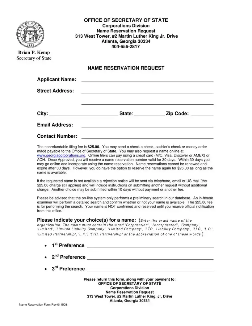 When starting a business in Georgia, one of the first steps is reserving a name that reflects your brand and complies with state regulations. The Georgia Name Reservation form is a crucial document that allows you to secure a business name for a limited period. For a nonrefundable fee of $25.00, you can submit your name reservation request either by mail or online. If you choose to file online, payment options include credit cards such as MasterCard, Visa, Discover, or American Express. Once your name is approved, you will receive a reservation number that is valid for 30 days, during which you can proceed with incorporating your business. It's important to note that name reservations cannot be renewed after the 30-day period, but you may reserve the name again if it remains available. If your requested name is unavailable, you will receive a rejection notice, and you can submit a new request within 10 days without incurring additional fees. However, the initial $25.00 fee will still apply. Keep in mind that while the online system provides a preliminary search, a detailed examination will confirm the availability of your name. To complete the form, you will need to provide your contact information and specify your name preferences, ensuring that your chosen name includes the required designations such as 'Corporation,' 'LLC,' or 'Limited Partnership.' Once completed, send the form along with your payment to the Office of Secretary of State, Corporations Division, in Atlanta.