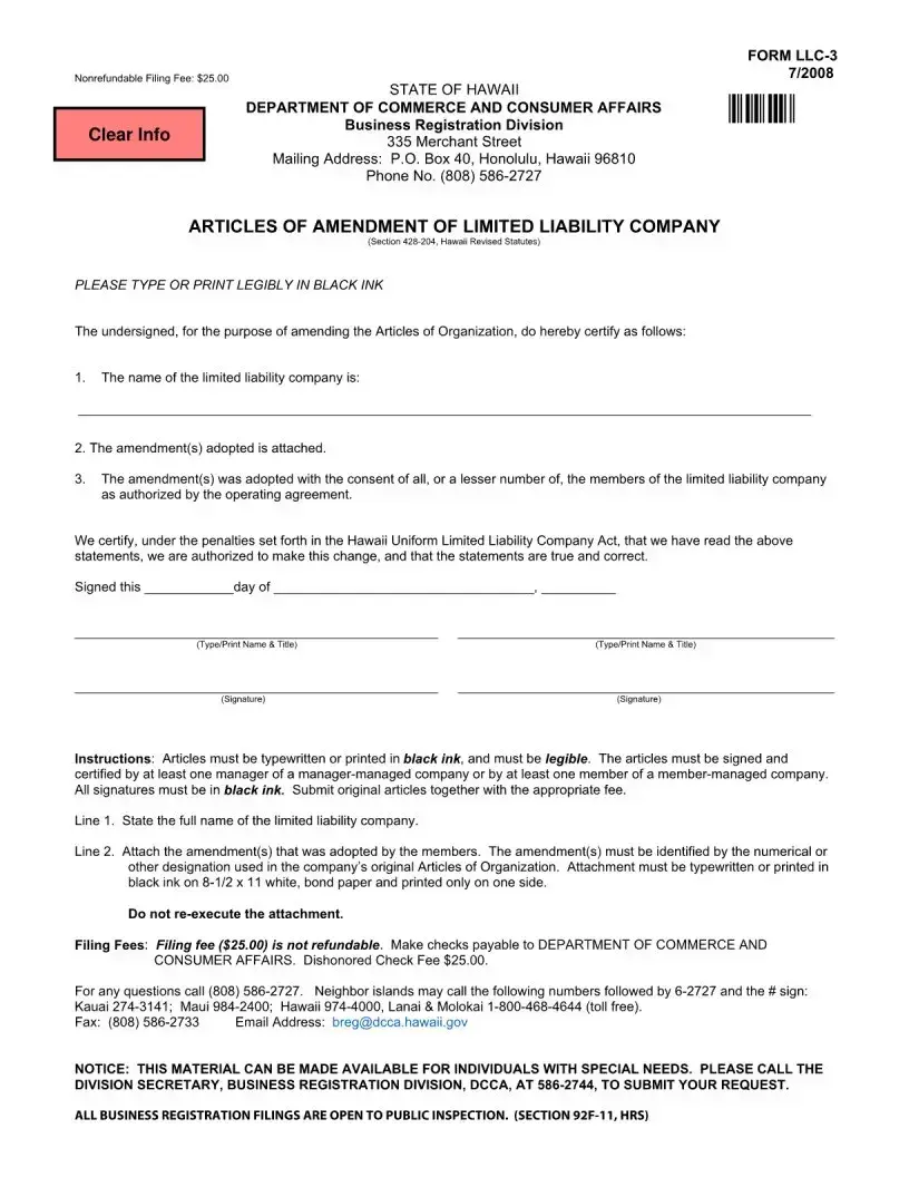 The Hawaii LLC 3 form serves as a crucial document for limited liability companies looking to amend their Articles of Organization. This form is filed with the Department of Commerce and Consumer Affairs and requires a nonrefundable filing fee of $25. When completing the form, it is essential to provide the full name of the limited liability company and to detail the specific amendments adopted by the members, as authorized by the operating agreement. The amendments must be attached and clearly identified, adhering to formatting guidelines that stipulate typewritten or printed text in black ink on standard white bond paper. Signatures from at least one manager or member are necessary to validate the submission. The form also emphasizes the importance of accuracy, as signers certify the truthfulness of the statements under penalties set forth in the Hawaii Uniform Limited Liability Company Act. For those needing assistance, the Business Registration Division offers resources and contact information, ensuring that all necessary support is accessible for a smooth filing process.