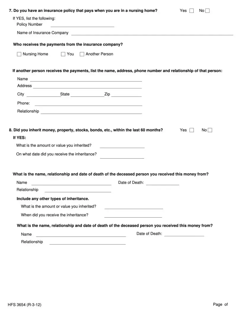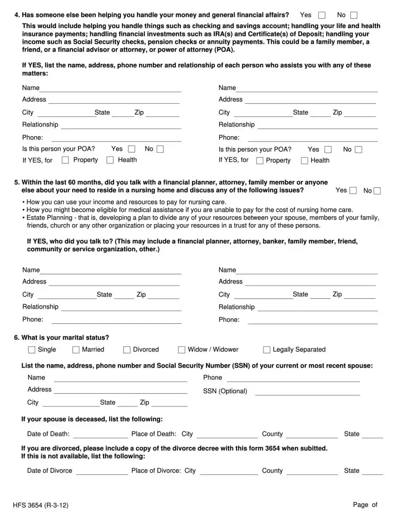 The HFS 3654 form is a critical document for individuals seeking long-term care assistance in Illinois. It serves as a comprehensive tool for the Illinois Department of Healthcare and Family Services to gather essential financial information from applicants. This form requires applicants to provide detailed answers to various questions about their financial status, including income, assets, and previous living arrangements. Applicants must indicate whether they have filed tax returns in the past five years and provide relevant documentation if applicable. The form also prompts individuals to disclose any assistance they receive in managing their finances, such as help from family members or financial advisors. Additionally, it addresses previous discussions about nursing home care and financial planning, ensuring that the applicant's situation is fully understood. Marital status and information about any insurance policies related to nursing home care are also crucial components. By completing the HFS 3654, applicants not only comply with state requirements but also pave the way for a smoother application process for medical assistance.
