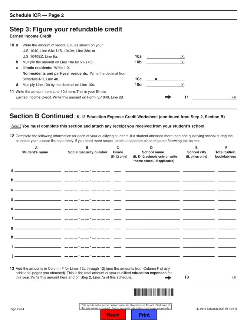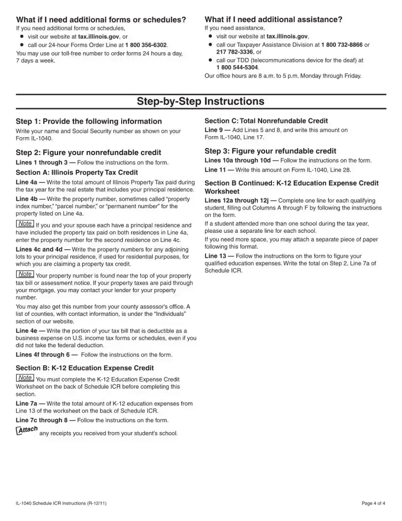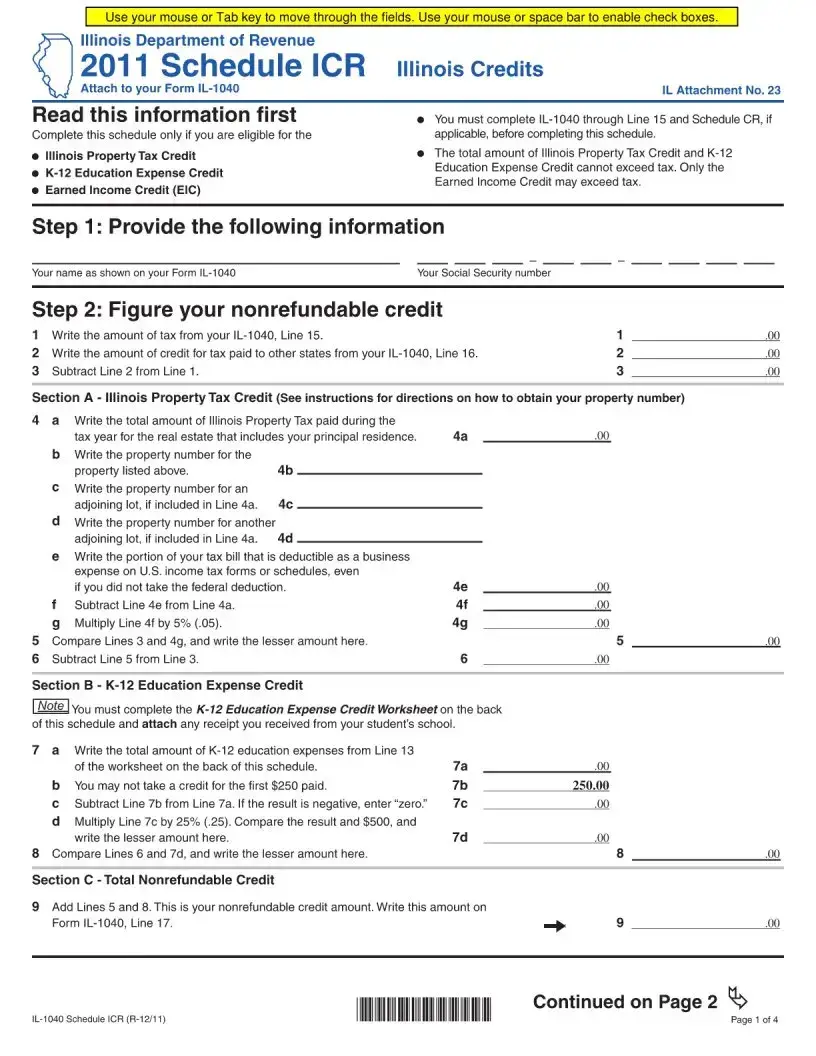 The Illinois Department of Revenue provides the ICR form, which is essential for individuals seeking to claim certain tax credits on their state income tax return. This form is specifically designed for those eligible for the Illinois Property Tax Credit, K-12 Education Expense Credit, and the Earned Income Credit (EIC). Before filling out the ICR, it is crucial to complete your Form IL-1040 through Line 15 and Schedule CR if applicable. The ICR form allows taxpayers to calculate both nonrefundable and refundable credits. For nonrefundable credits, individuals will need to report their property tax payments and education expenses, ensuring that the total credits do not exceed their tax liability, except for the EIC, which can exceed the tax owed. The form requires personal information, such as your name and Social Security number, and guides you through a series of calculations to determine the credits for which you qualify. By following the steps outlined in the ICR, taxpayers can accurately report their eligible credits and potentially reduce their tax burden.