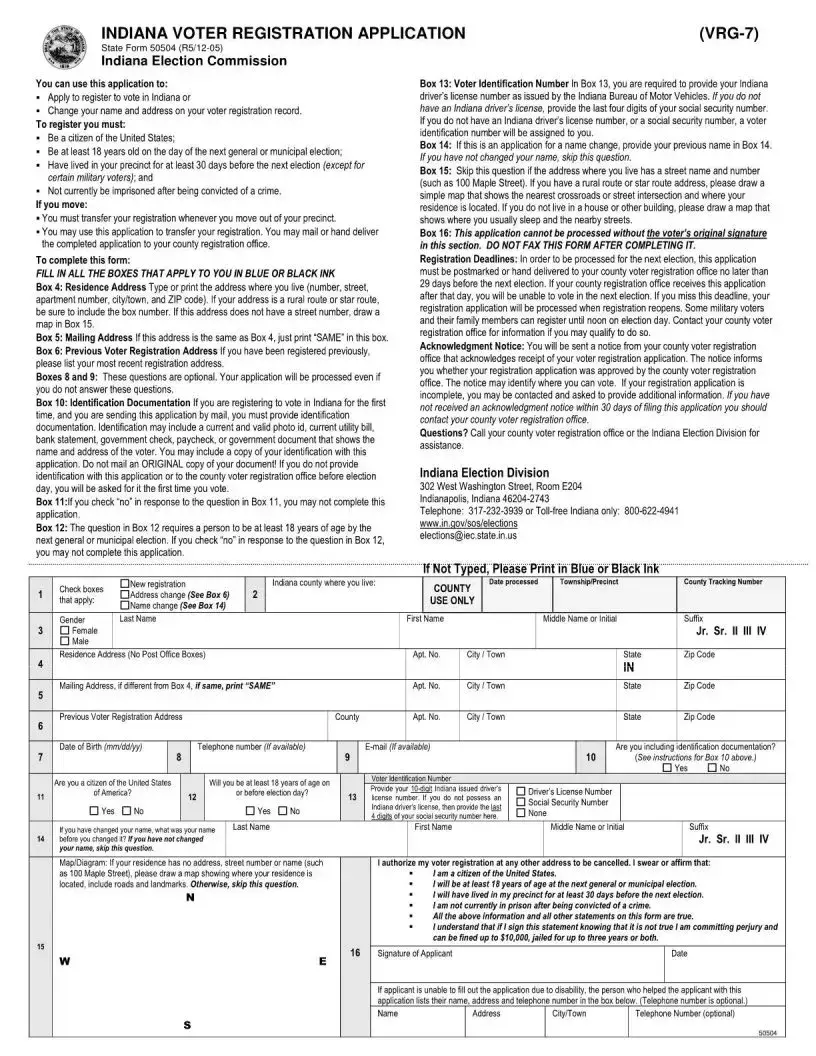 The Indiana State 50504 form, also known as the Indiana Voter Registration Application, is used to register to vote in Indiana. It can also be used to change your name or address on your existing voter registration record.