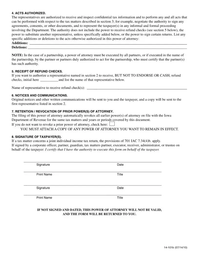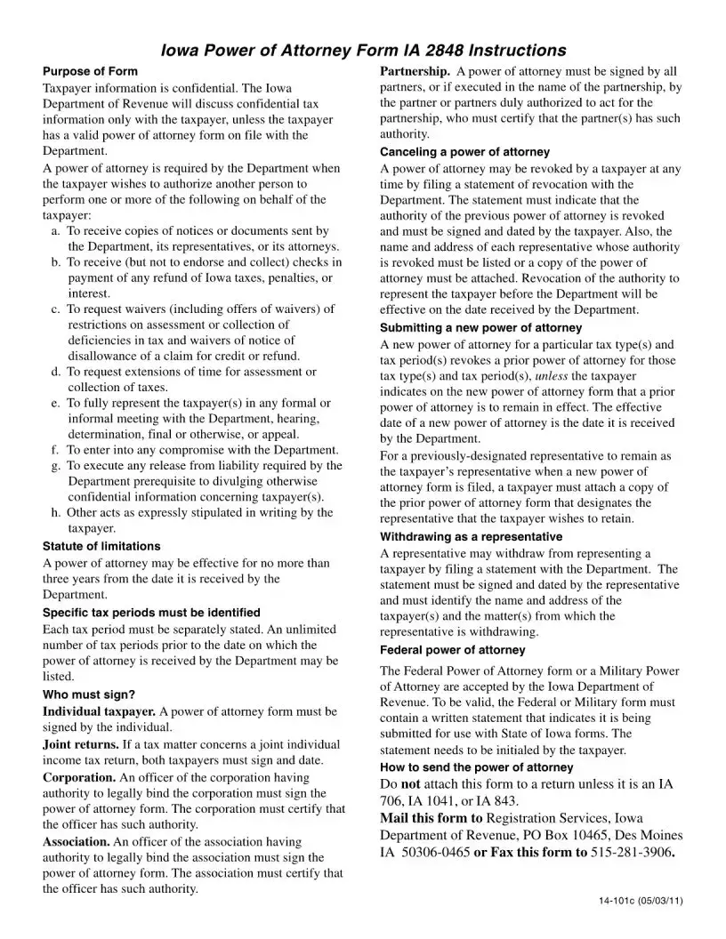 The Iowa IA 2848 form is a Power of Attorney document that allows taxpayers to appoint representatives to act on their behalf before the Iowa Department of Revenue. This form is valid for a maximum of three years from the date it is received by the Department. It is essential to complete all sections accurately to avoid delays or invalidation of the form.