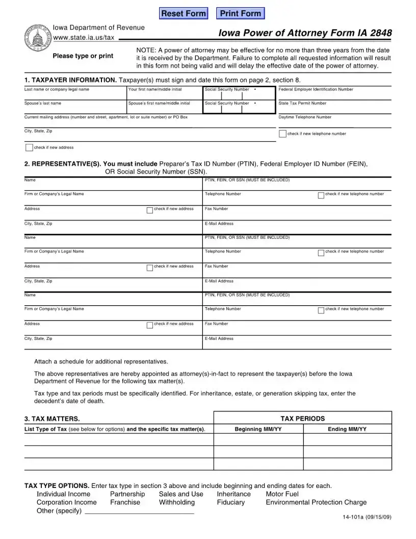 The Iowa IA 2848 form serves as a crucial document for taxpayers who wish to grant authority to a representative, such as a tax professional or attorney, to act on their behalf before the Iowa Department of Revenue. This form is specifically designed to facilitate the management of various tax matters, including individual income, sales and use, and corporate taxes, among others. Importantly, the IA 2848 is valid for a maximum of three years from the date it is received by the Department, emphasizing the need for timely and accurate completion. Taxpayers must provide essential information, including their names, Social Security numbers, and current mailing addresses, as well as details about their appointed representatives, such as their names and tax identification numbers. The form also outlines the specific tax matters and periods that the representatives are authorized to handle, ensuring clarity in the scope of their authority. Additionally, taxpayers can authorize representatives to receive refund checks, although they cannot endorse or cash them. It is vital to note that submitting this form automatically revokes any prior powers of attorney related to the same tax matters, reinforcing the importance of careful consideration when designating representatives. Failure to complete the form accurately can lead to delays and invalidation, making attention to detail paramount.