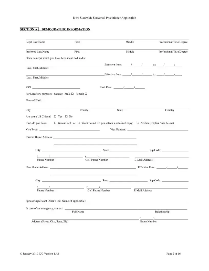 The Joint Commission's Credentialing and Privileging Application is another document with similarities to the Iowa Universal Application. This application is used by healthcare organizations to assess the qualifications of practitioners seeking to work within accredited facilities. Both forms require detailed demographic information and professional history, reinforcing the importance of thorough vetting to maintain high standards of care.