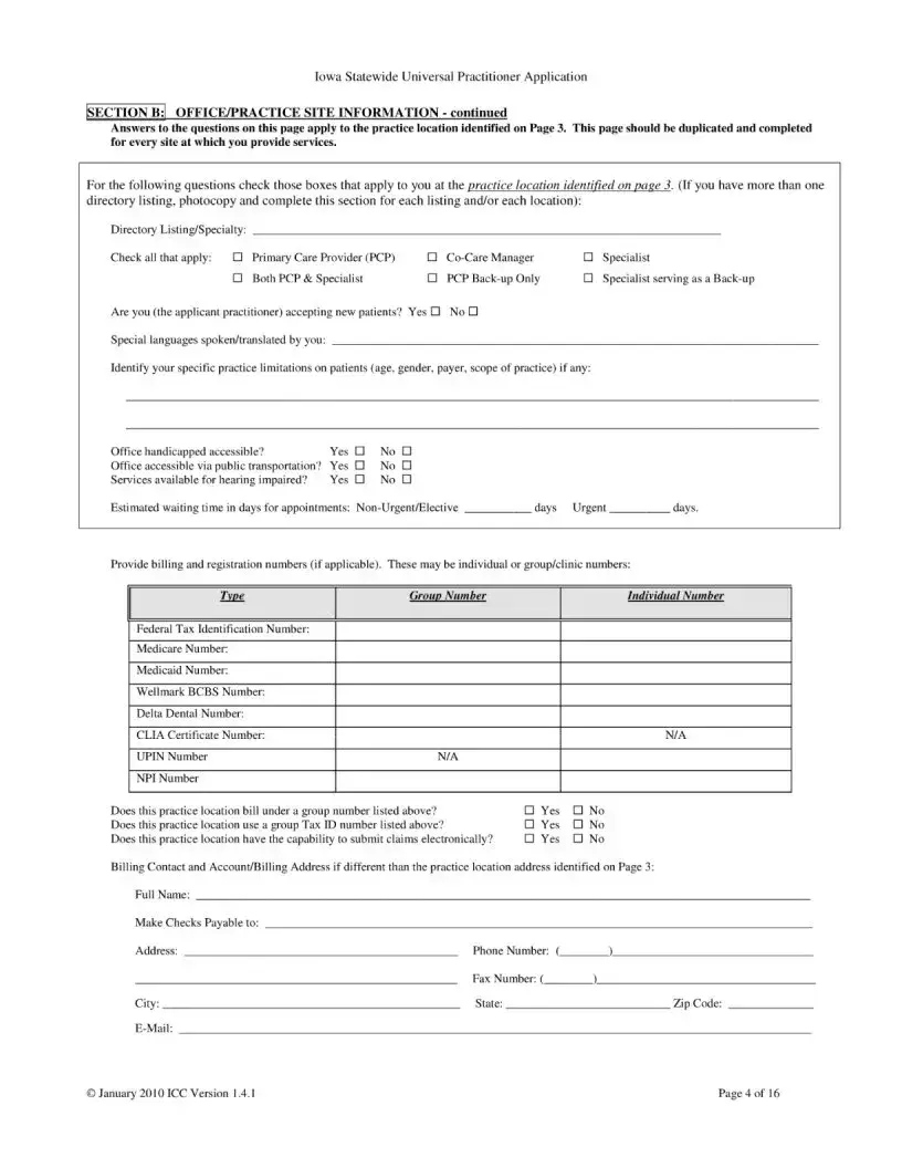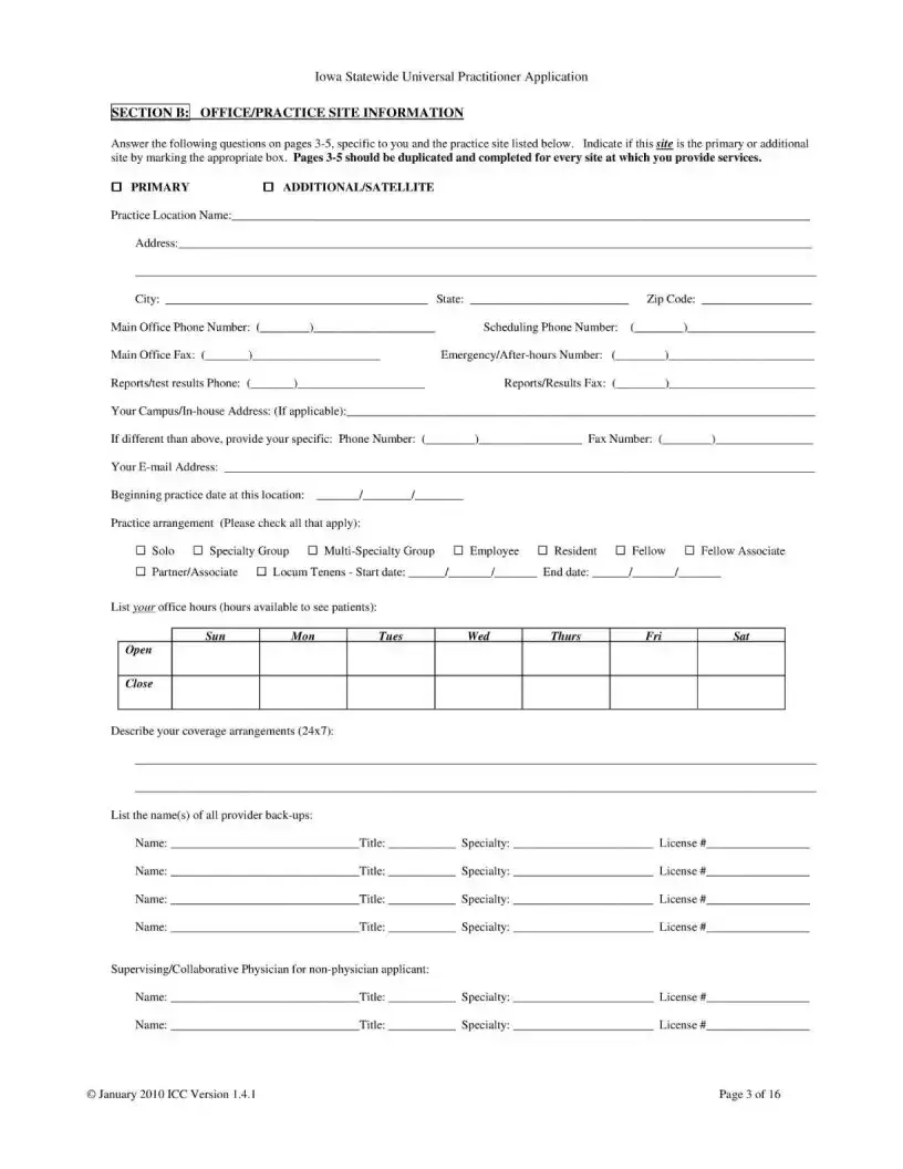 The Iowa Universal Application form is an essential tool for healthcare practitioners seeking to establish their credentials across various practice settings in Iowa. This comprehensive application requires detailed personal and professional information, including your name, title, and practice specialties. It emphasizes the importance of completing the form thoroughly, specifying that a CV cannot replace any responses. Practitioners must provide demographic details, such as Social Security Number, citizenship status, and contact information. Additionally, the form asks about your practice site, including whether it’s a primary or additional location, and requires specifics like office hours and emergency contact arrangements. The application also covers aspects related to billing, such as tax identification numbers and the capability to submit claims electronically. By gathering this information, the Iowa Universal Application aims to streamline the credentialing process, ensuring that healthcare providers can offer their services effectively while meeting regulatory requirements.