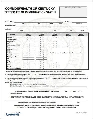 All vaccines administered are printed on the Commonwealth of Kentucky Certificate of Immunization Status now including immunizations not required for school entry.
