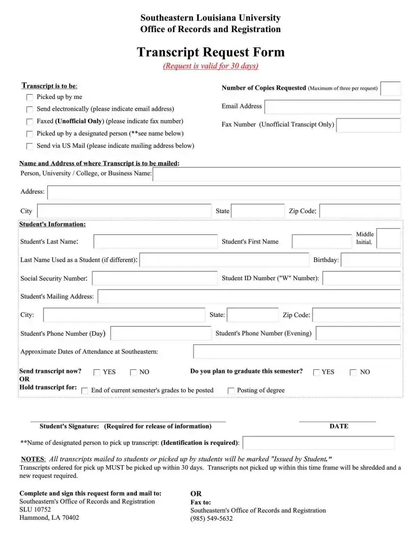 The Louisiana Request form is an essential document for students seeking to obtain their academic transcripts from Southeastern Louisiana University. This form allows individuals to specify how they would like to receive their transcripts, whether by pickup, email, fax, or traditional mail. It is important to note that the request is valid for only 30 days, emphasizing the need for timely action. Students must provide their signature, which is required for the release of their information. The form also includes sections for the number of copies requested, with a maximum of three allowed per request. If a student chooses to have someone else pick up the transcript, they must designate that person on the form, as identification will be required. Additionally, all transcripts sent to students or picked up will be marked as "Issued by Student." If transcripts are not picked up within the 30-day window, they will be shredded, necessitating a new request. Completing and signing the form is crucial, and it can be mailed or faxed to the Office of Records at Southeastern Louisiana University.