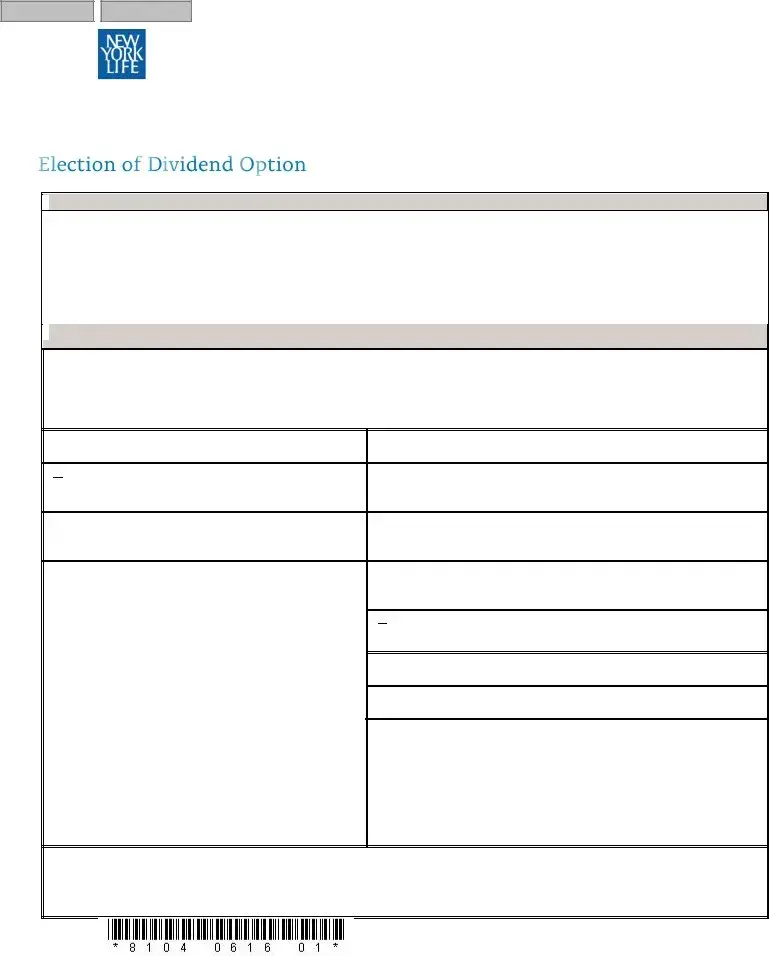 The New York 8104 form is an important document for policyholders of New York Life Insurance Company, facilitating various requests related to life insurance policies. This form allows policy owners to change their dividend options, which can significantly impact the financial benefits of their policies. For instance, policyholders can choose to apply dividends toward premium payments, leave them to accumulate interest, or convert them into paid-up additions. Additionally, the form includes a section for income tax withholding elections, ensuring compliance with IRS regulations. Proper completion of the 8104 form is essential, as it requires personal information, including the policy number, owner details, and tax identification numbers. Understanding the implications of each option is crucial, as the choices made can affect future benefits and tax liabilities. The form also outlines specific instructions regarding deadlines and conditions for dividend changes, making it a vital tool for managing life insurance policies effectively.