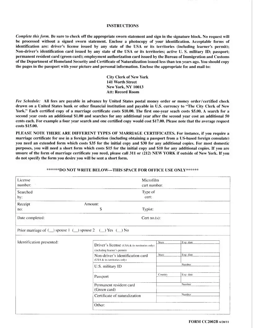 The New York CC2002B form is essential for anyone seeking to obtain marriage records from the City of New York. This form allows individuals to request either a short form or an extended form of the marriage certificate, depending on their specific needs. It caters to various parties, including the individuals involved in the marriage, their relatives, or attorneys representing them. The form requires detailed information, such as the date of marriage, the borough where the license was issued, and the full legal names of both spouses before marriage. Importantly, it outlines strict eligibility criteria for accessing records, especially for those less than fifty years old, ensuring that only authorized individuals can obtain sensitive information. Additionally, the form specifies the required fees and acceptable forms of identification, emphasizing the need for a signed sworn statement for processing. Completing this form accurately is crucial, as it directly impacts the ability to secure the necessary documentation for legal or personal purposes.