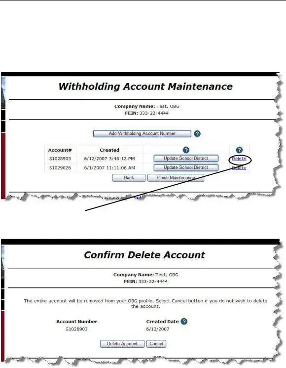 You may remove a withholding account from your Company profile using the Withholding Account Maintenance page. Removing the account from your profile does not delete the account completely, it only removes it from your filings with the OBG. You may only delete/cancel an account permanently during the final withholding filing process.