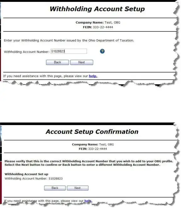 Use the Withholding Account Set-up Wizard to associate a withholding account number with a specific Company Name/FEIN (dipslayed at the top of the web page). Only the Ohio Department of Taxation can issue a new account number. Contact ODT to obtain a new withholding account number.