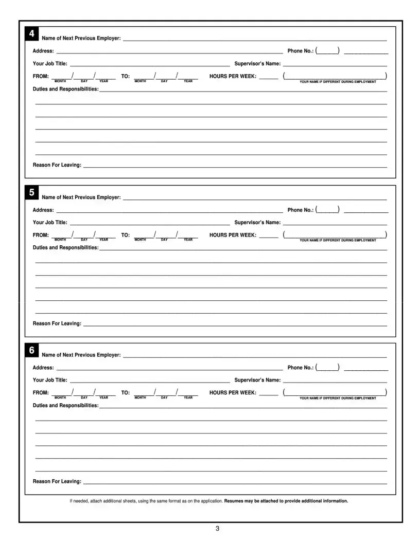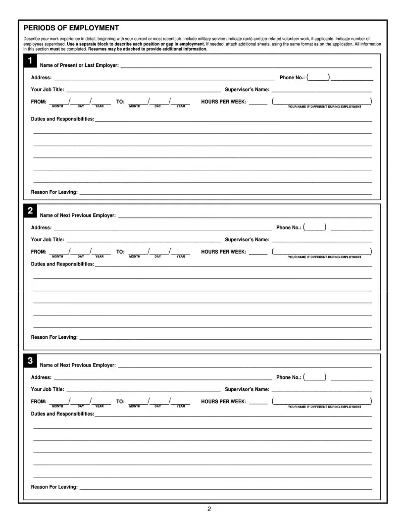 Yes, you must describe your work experience in detail. Start with your current or most recent job and include military service and job-related volunteer work. Indicate your job title, employer's name, address, phone number, and the duties and responsibilities for each position. If necessary, attach additional sheets to provide complete information.