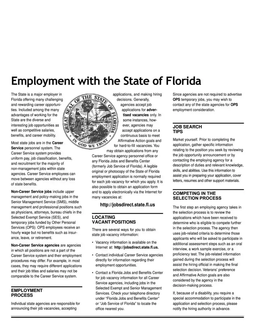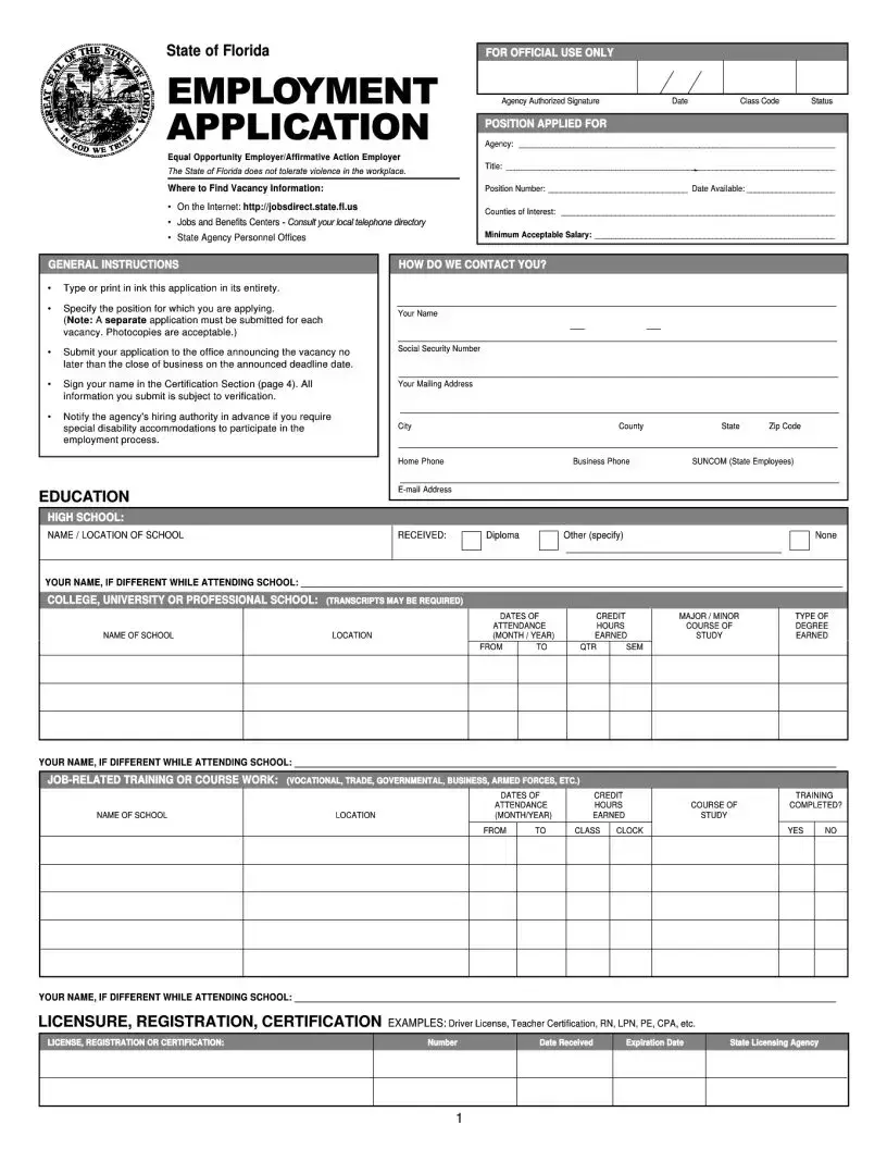 The State of Florida Employment Application form serves as a crucial tool for individuals seeking employment within state agencies. This form is designed to collect essential information from applicants, including personal details, educational background, and work experience. Applicants must specify the position they are applying for, as each vacancy requires a separate application. The form emphasizes the importance of accuracy and completeness, urging candidates to type or print their responses clearly. Additionally, the application includes sections for listing relevant licenses, certifications, and job-related training. To ensure compliance with the state's equal opportunity policies, applicants are reminded of the importance of providing truthful information, as all submitted details are subject to verification. The form also addresses the need for special accommodations for those with disabilities during the hiring process. Understanding the structure and requirements of this application is essential for candidates aiming to navigate the employment landscape in Florida effectively.