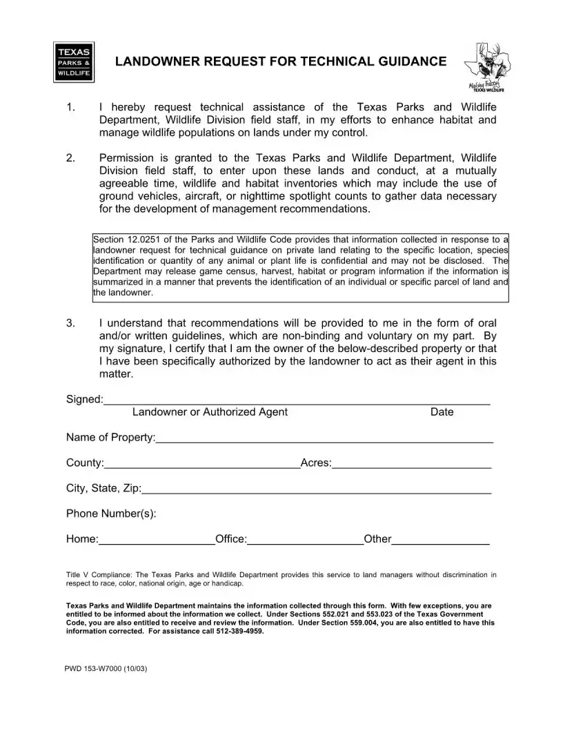 Filling out the Texas PWD form requires careful attention to detail to ensure all necessary information is accurately provided. This form is essential for landowners seeking technical assistance or managing wildlife on their properties. Below are the steps to guide you through the process of completing the form.