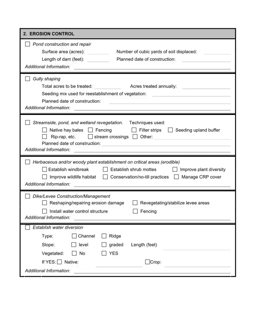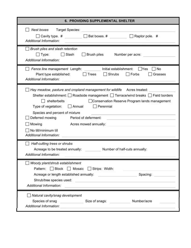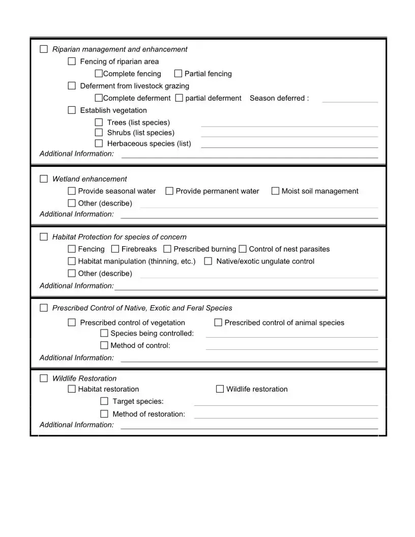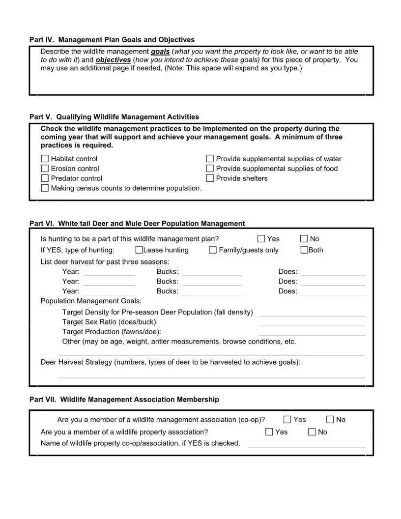 The Wildlife Management Plan form aligns closely with the National Resource Conservation Service's (NRCS) Conservation Plan. Both documents serve to outline management goals and practices for landowners. The Wildlife Management Plan focuses on wildlife, while the NRCS plan encompasses broader conservation efforts. Each requires landowners to define their objectives and the strategies they will implement to achieve them, promoting responsible land stewardship.