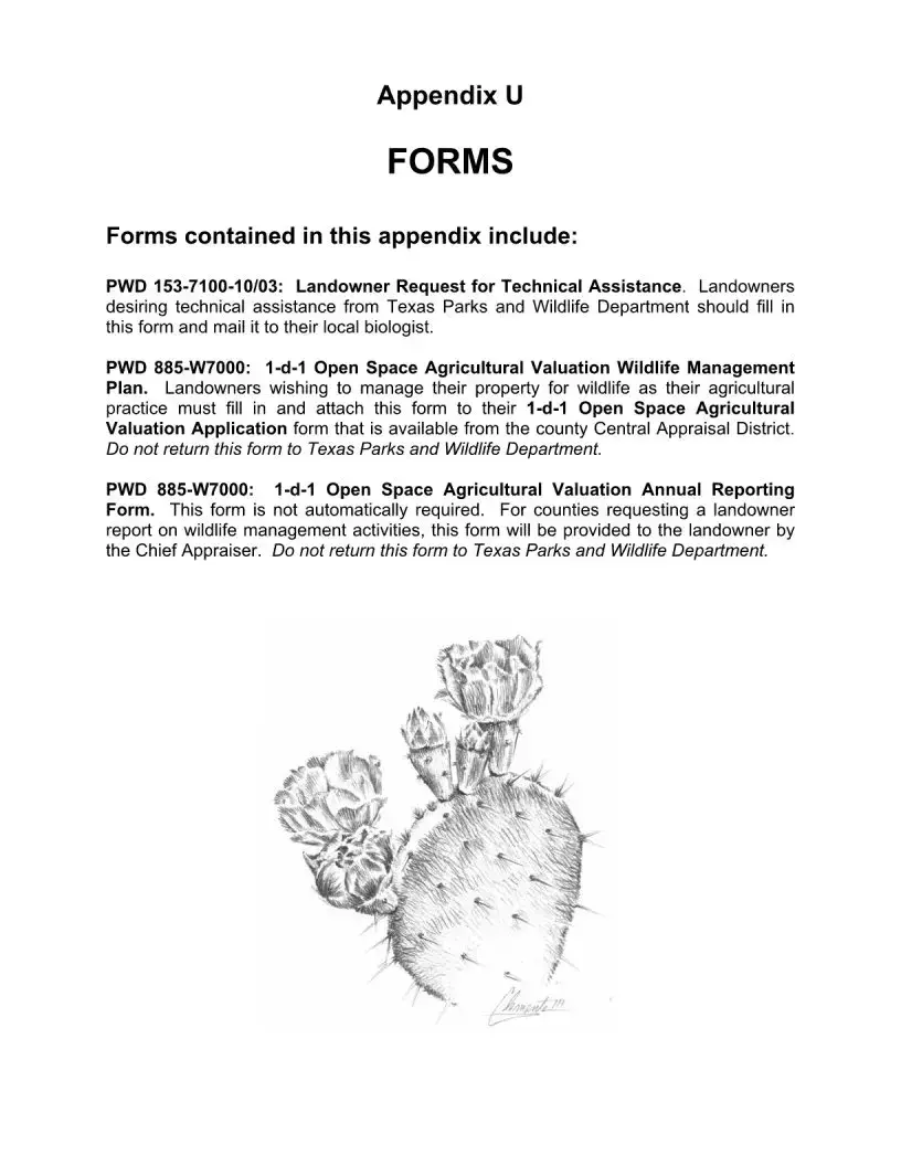 The Texas Parks and Wildlife Department provides essential forms for landowners interested in wildlife management and habitat enhancement. One key form is the PWD 153-7100-10/03, which allows landowners to request technical assistance from local biologists. By submitting this form, landowners can receive guidance on managing their properties for wildlife. Another important document is the PWD 885-W7000, which pertains to the 1-d-1 Open Space Agricultural Valuation Wildlife Management Plan. This form must be attached to the 1-d-1 Open Space Agricultural Valuation Application and is crucial for those looking to manage their land for wildlife as part of their agricultural practices. Additionally, there is the PWD 885-W7000 Annual Reporting Form, which some counties may require for reporting wildlife management activities. It’s important to note that this form is not automatically required and will be provided by the Chief Appraiser if necessary. Each of these forms serves a distinct purpose, helping landowners navigate the process of wildlife management while ensuring compliance with state regulations.