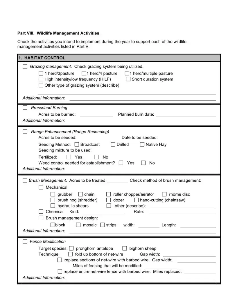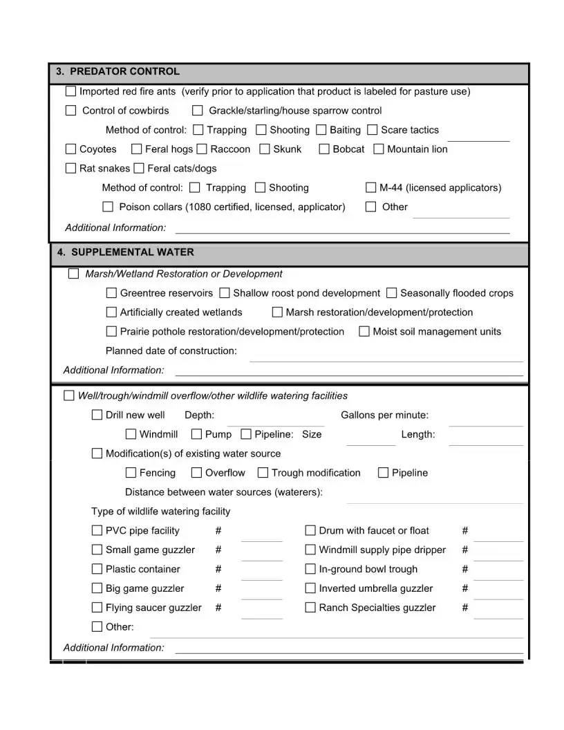 Lastly, the Texas PWD form shares characteristics with the State Water Resources Control Board's Water Use Report. Both documents require landowners to provide detailed information about their management practices and the resources they utilize. The Texas form focuses on wildlife management, while the Water Use Report addresses water conservation. Each document plays a vital role in ensuring responsible resource management and compliance with state regulations.