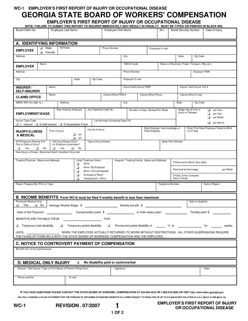 Filling out the WC-1 form is an important step in reporting an injury or occupational disease in Georgia. It’s essential to complete this form accurately and promptly to avoid potential penalties. Once you have filled out the form, it should be submitted to your insurance company or self-insurer claims office immediately.